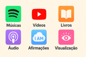 Ferramentas essenciais incluem apps de visualização, livros especializados, boards de visão digitais, meditações guiadas e planners de manifestação para organizar e potencializar o processo.